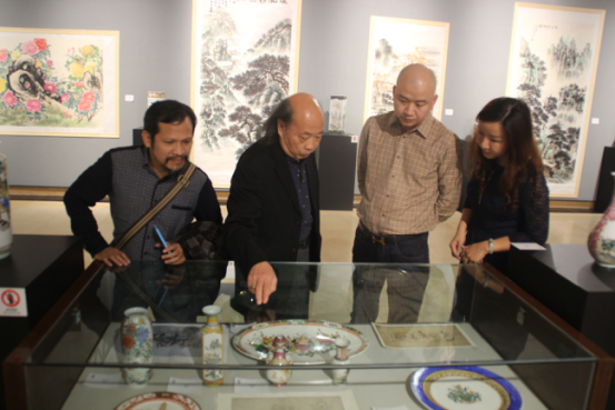 劉致遠作為國畫、廣彩陶藝大師劉群興之子,也自幼隨父學習國畫及陶瓷制作,其廣彩作品色澤鮮明,絢麗多彩,既師吸收統(tǒng)繪畫技法,又仿造西洋畫法,頗具嶺南畫派折衷中西的精髓。其國畫松樹題材的創(chuàng)作,盡顯崇山峻嶺之中,松之勁峭與水之嫵媚,其繪制的山水題材彩瓷既有山河磅礴之態(tài)勢、又具匠心細刻之精致。此次兩位嶺南畫派傳承人在此展出他們的作品,內(nèi)容、風格各異,交相輝映,很好地承傳了嶺南畫派的要義。