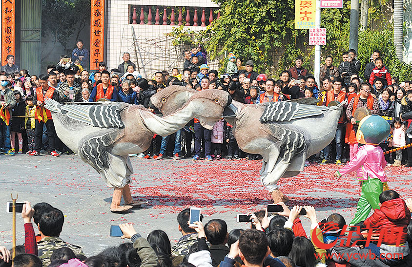 元宵節(jié),澄海蓮下鎮(zhèn)陳厝洲鄉(xiāng)一年一度的游神活動(dòng)。巡游隊(duì)伍最有代表性的就是澄?!半p咬鵝舞”,始創(chuàng)于上世紀(jì)五十年代初,由于澄海盛產(chǎn)獅頭鵝,有“鵝鄉(xiāng)”之稱。故澄海人創(chuàng)制了獅頭鵝藝術(shù)造型。類似的例子還有潮汕地區(qū)的蜈蚣舞、蚌殼舞等,只有幾十年的歷史林桂炎 攝