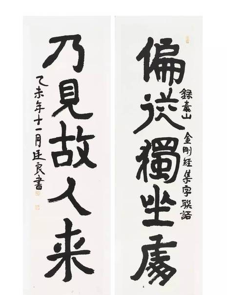 鐘廷良學(xué)書的過程離不開他的收藏,也得益于他的收藏!2011年收得清代書壇巨匠伊秉綬一副對聯(lián)后,細細研摩臨寫。此后,也有所悟所得。2012年收得民國舊拓“泰山金剛經(jīng)”集聯(lián)后,對泰山金剛經(jīng)刻石奉為至尊,敬若神明。爾后,凡作大字,皆以其為架構(gòu),而其書也漸有可觀者。由于長期從事文字工作之關(guān)系。讀書,亦成了鐘廷良生活的一部分。其深知唯有讀書方能為書法注入養(yǎng)分。唯有知識方能豐富書法內(nèi)涵。鐘廷良的書法,尊崇于中國傳統(tǒng)文化所倡導(dǎo)的書論和畫理。在學(xué)習(xí)古人、先賢經(jīng)典的基礎(chǔ)上,小心求索,認真創(chuàng)作。既注重以古為師,又融匯時代精神,孜孜不倦,其書漸入佳境。