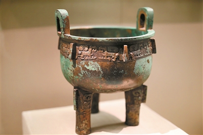 在此次展出的青銅器中,有一部分是僅銘有族氏銘文的,即家族的名號(hào),以表示是該物品的所屬人。代表族徽的銘文,象形的程度會(huì)比較高,主要用作禮器。比如展出的鳥(niǎo)父甲鼎,內(nèi)里的銘文就是自上而下三個(gè)字,其中“鳥(niǎo)”字則幾乎完全是鳥(niǎo)的象形,這個(gè)鳥(niǎo)就是鳥(niǎo)族的族徽,鳥(niǎo)族族群在當(dāng)時(shí)十分龐大。而后面兩個(gè)字就是“日名”,日名是指古人對(duì)逝人的稱(chēng)謂,一般以甲乙丙丁戊己庚辛壬癸十天干前加上受祭者的輩分格式出現(xiàn)。這種禮器又叫做日名器,既點(diǎn)明了受祭者,又表明了作器者和受祭者的關(guān)系。