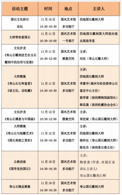 不僅如此,來(lái)自四地的國(guó)家級(jí)、省級(jí)工藝美術(shù)大師、非物質(zhì)文化遺產(chǎn)傳人將親臨深圳, 展覽期間,舉辦名家對(duì)話論壇,開(kāi)設(shè)兩場(chǎng)名石雕刻藝術(shù)公開(kāi)講座,另逢周末將特邀兩位國(guó)石大師在現(xiàn)場(chǎng)為觀眾導(dǎo)賞。