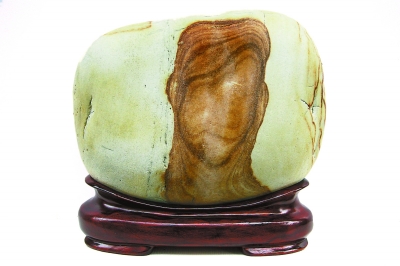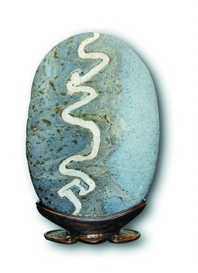 金沙江卵石的種類繁多,主要有芙蓉石、墨畫石、油畫石、龜紋石、螺鈿石、松花石、丹彩石、牧羊石、金剛石、燙畫石、彩蠟石、金沙彩等。這些石頭到底有多好,水富縣的石友們總結(jié)出十大美——天然美、色彩美、線條美、石質(zhì)美、形象美、裝飾美、朦朧美、含蓄美、空靈美、意境美。如果沒有江水長(zhǎng)年累月的沖刷和搬運(yùn),也就不會(huì)形成這么多美麗的石頭。水富縣奇石辦多次組織當(dāng)?shù)氐氖虆⒓尤珖?guó)石展,幾年來,捧回特等獎(jiǎng)一枚,金獎(jiǎng)185枚,銀獎(jiǎng)420枚,優(yōu)秀獎(jiǎng)600枚。好像是在夸自己,曹會(huì)長(zhǎng)說得有些臉紅,用手拍打起石頭來。在一旁的老伴兒說,老曹一高興就愛拍石頭,說石頭能聽懂他的話。這倒讓我想起著名美學(xué)家王朝聞贊美奇石的一首詩(shī):“石居人外,人在石中。相擊相和,創(chuàng)造對(duì)方。”
