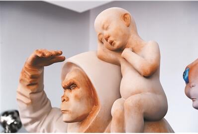 傅榆翔介紹,他創(chuàng)作的初衷并非只是讓參觀者欣賞作品,而是邀請觀眾參與其中。比如在這群外星人中,領(lǐng)隊(duì)的是一只巨大的穿著航天服的猩猩,神情莊嚴(yán),左手卻溫柔地牽著一個(gè)類似女外星人的手,肩膀上坐著一個(gè)孩子,頭像克隆了傅榆翔本人,而身體又是嬰兒。傅榆翔說,這體現(xiàn)了他對人與自然關(guān)系的思考,并希望借此來提醒以自我為中心的人類應(yīng)該有所反思。
