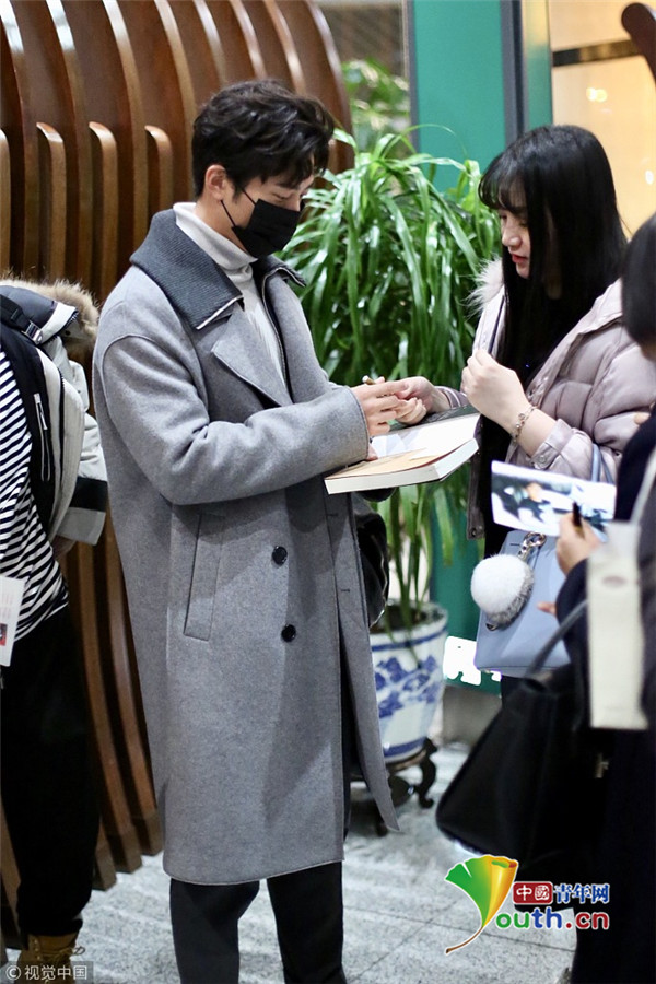 ??2017年12月13日,北京,竇驍身著灰色大衣、戴口罩現(xiàn)身機(jī)場,為粉絲大方簽名,見鏡頭開心比V揮手親和力滿分。
