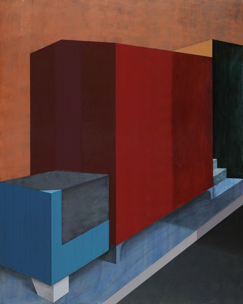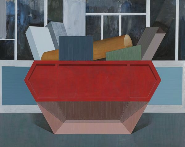 趙新宇作品當(dāng)中的圖式來源,無論是從攝影作品中或者裝置作品中抑或現(xiàn)實(shí)當(dāng)中選取某個(gè)場景的邊角,從某種程度上,均服從于他個(gè)人基于謹(jǐn)慎的、甚至敏感的內(nèi)在壓制,正如《室外2#容器》背景的窗框,稱其為窗框,倒不如把它當(dāng)作畫面整體結(jié)構(gòu)的一個(gè)同級(jí)邏輯走向,正如同置放在背景前的所謂“容器”當(dāng)中的幾何體,是幾何化了的現(xiàn)實(shí)物與根據(jù)畫面再行部分添加的合奏,在某種程度上,也可以說是塞尚繪畫理念的一則變異體。