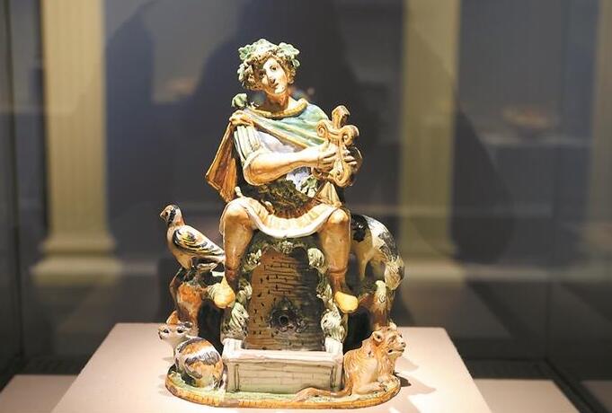 還有一些作品直接被塑為人形,比如16世紀(jì)末,由烏爾比諾的潘塔納茲工坊所作的人像水罐,表現(xiàn)的是傳說中半人半神的奧菲歐彈奏豎琴迷惑動物,他坐在一個(gè)圓桶上,液體從桶下方的小孔流入池中。據(jù)克勞迪婭·卡薩利介紹,這件產(chǎn)品專為私人居所而設(shè)計(jì),可能在豪奢的宴會上用作烈酒容器。