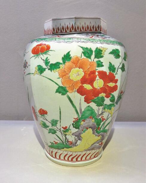 五彩牡丹椿紋八角瓶,有田燒。江戶時(shí)代17世紀(jì)后期。