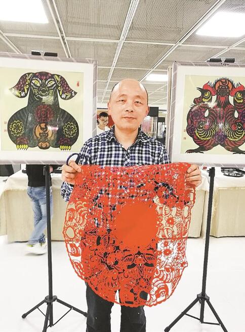游洋此次帶來整套的大幅套色十二生肖剪紙。他的剪紙作品中,單色剪紙融入了版畫的技法、裝飾畫構(gòu)圖,彩色剪紙采用拼色方法,套色、染色等技法并用,已超出普通民間剪紙范疇,形成了具有濃郁個(gè)人風(fēng)格的“石羊剪紙”。