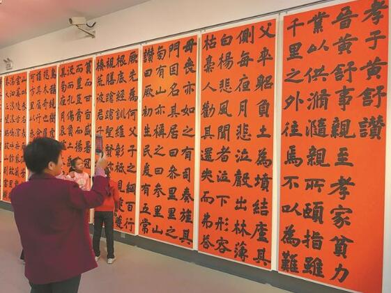 據(jù)了解,此次展覽不同于普通的書法展,而是以“孝德”為內(nèi)容的主題創(chuàng)作展,所有作品都圍繞孝文化進(jìn)行創(chuàng)作,每一幅作品都在講述一個(gè)關(guān)于孝文化的故事。在“孝德”大主題下,又分了幾個(gè)小專題,比如“二十四孝專題”“孝經(jīng)專題”“金石題跋專題”,還有本土的“孝德寶安專題”。當(dāng)天的展覽吸引了大量觀眾,不少觀眾還帶著小孩參觀,黃女士告訴記者,“今天帶著小孩來(lái),一是欣賞書法,二是希望小孩了解一下傳統(tǒng)的孝德文化,我們通過(guò)書法還了解到寶安孝子黃舒的故事?!?/p>