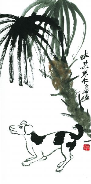 隨著上世紀(jì)九十年代國內(nèi)寵物熱的興起,狗越來越多地進(jìn)入大眾的日常生活,頻頻成為當(dāng)代畫家的表現(xiàn)對象。當(dāng)代大家黃永玉先生的水墨畫,具有諷刺與幽默的色彩,他畫的狗系列畫作,令人忍俊不禁。著名畫家史國良的西藏風(fēng)情畫中,我們也經(jīng)常能看到狗的身影,如他畫的《八角街上》,畫中靜臥一角的黑狗使整個畫面平添了許多生活氣息。古今畫狗的名家名作還有很多,實難一一列舉。狗的忠誠、溫順是人類的最愛,正緣于狗與人類的這種特殊關(guān)系,狗才成為畫家們百畫不厭的題材。