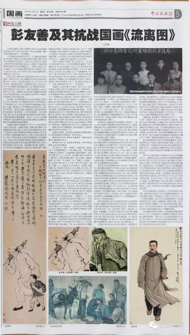 彭友善一生主要參加了兩次美術(shù)界的盛會。第一次是1937年國民政府教育部第二次全國美展,其以《噩夢》、《大同世界》、《華清池》、《伴侶》四幅巨作同時入選而獨自打破了參展數(shù)量和作品尺寸二項記錄,成為這屆美展最耀眼的新星,被媒體稱為“新國畫的鼻祖”,其中《噩夢》一畫入選日本版之《世界名畫全集》,并順理成章成了中華美協(xié)的發(fā)起人之一,是年彭友善才二十六歲。另一次是參加1954年的新中國第二屆全國美展,其參展作品是大型人物主題創(chuàng)作《方志敏漆工鎮(zhèn)暴動勝利圖》,獲本屆美展最高榮譽(yù)獎,并成為當(dāng)年人民美術(shù)出版社出版的美展專集首頁。兩次大展的參與者,均為中國美術(shù)界的重量級人物,彭友善與之同臺競技而脫穎而出,可見其功力非同一般,其歷史地位更不應(yīng)被埋沒?!俺鋵嵍泄廨x”(周谷城語),“千秋筆墨驚天地”(李苦禪語)“超真筆墨功力堪列國內(nèi)一流畫家方陣,經(jīng)得起歷史檢驗?!保ǔ檀罄Z)都是對彭友善藝術(shù)成就的中肯評價。