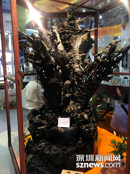 宋智勇以“孝”為創(chuàng)造源泉,把孝道文化和地方特色元素相融合,捕捉生活細(xì)節(jié),完美植入雕刻工藝中。今年他更是將根雕工藝帶到了文博會現(xiàn)場,為觀眾演示一個根雕作品的誕生。