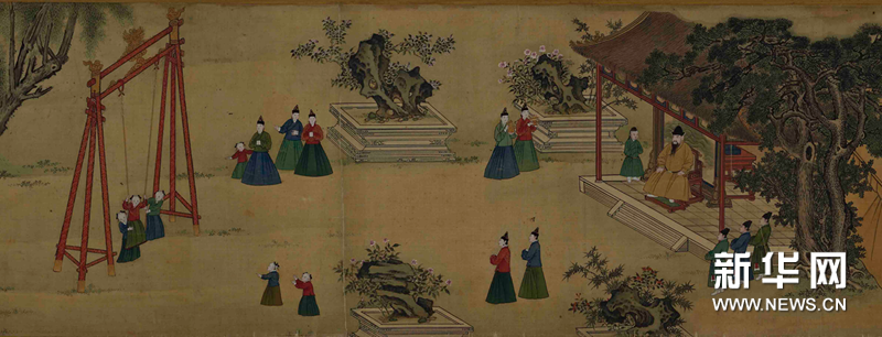 與明代帝王有關(guān)的行樂圖,目前存世有數(shù)幅,如中國國家博物館藏《憲宗元宵行樂圖》、北京故宮博物院藏《明宣宗行樂圖》卷等。此幅《四季賞玩圖》,曾在大英博物館“明:皇朝盛世五十年”展覽中展出。畫卷描繪皇室四季賞花行樂的場景,春日賞牡丹、夏季賞紅蓮、重陽賞金菊、冬季賞雪梅。頭戴黑色便帽、身穿繡金龍袍的憲宗皇帝,前后共5次出現(xiàn)在畫面里。松樹亦出現(xiàn)在各個橋段,扮演重要角色:一開始,憲宗皇帝坐在雙松下的草堂里觀看女童蕩秋千;春賞牡丹時,憲宗所坐的琉璃涼亭外,被古松圍繞;秋冬交界處,以青松和雪松表示季節(jié)的變化,雪松下的便殿也銀裝素裹,憲宗也換上棉袍,戴著貂皮帽。畫面瑰麗堂皇,一派太平喜樂氛圍。