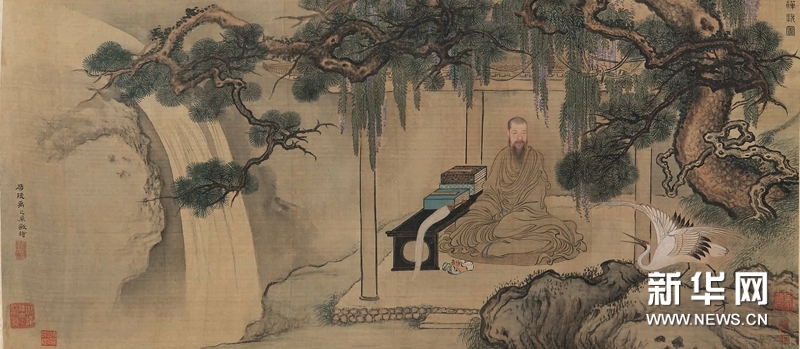 禹之鼎,清初畫家。字尚吉、上吉、尚基,江蘇揚(yáng)州人。康熙年間供奉內(nèi)廷,授鴻臚寺序班,入值暢春園。工山水、人物,尤精寫真,作品多為當(dāng)時(shí)的重臣文翰傳神寫照,“一時(shí)都下名公通人描畫殆遍”,自稱“必逢佳士亦寫真”,是繼晚明曾鯨之后又一位杰出的肖像畫家。此圖作于康熙三十九年,作者時(shí)年五十四歲。傳主為清初文壇領(lǐng)袖王士,曾在揚(yáng)州為官,禹之鼎十多次為他畫像?!岸U悅”一詞是佛教用語,形容參禪悟道之后的法喜。此畫借佛教精神,彰顯中心人物退養(yǎng)林泉、游神禪悅的氣韻風(fēng)度。用筆纖潤,設(shè)色明麗,一株象征長(zhǎng)青不老的百尺翠松橫貫畫面,松蘿低垂覆罩茅廬,松下白鶴振翅,引吭向天,茅廬里趺坐這位著淡黃衲衣的一代宗匠。幾案上放置經(jīng)函和拂塵,茅廬外澗泉如明月,此類澗泉多見于水月觀音畫。