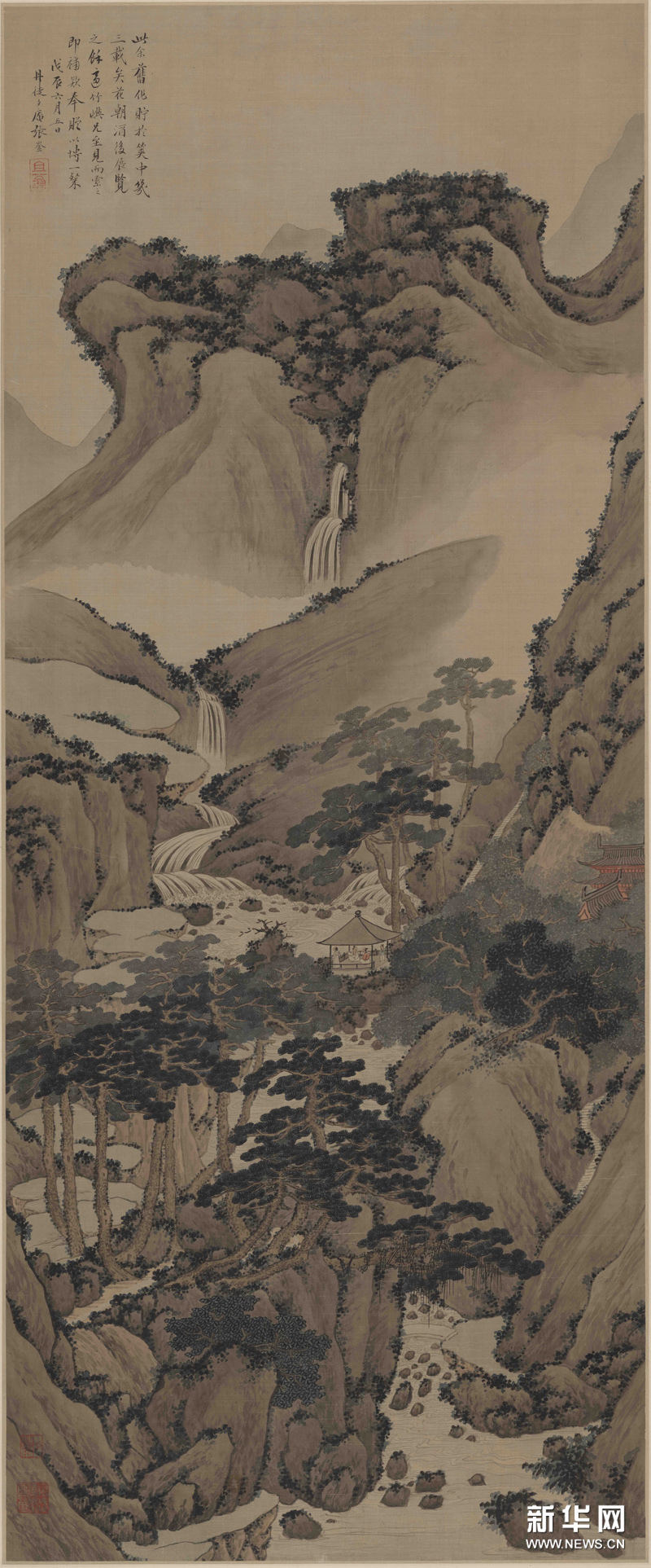 張崟,字寶崖,一字寶巖,號(hào)夕庵、且翁、夕庵老人,鐵甕城東蟄叟。丹徒(今江蘇鎮(zhèn)江)人,所居曰“飲淥草堂”。幼承家學(xué),以詩畫著名京江?;ɑ?、竹石、佛像皆佳,尤擅山水,善畫松,時(shí)顧鶴慶善畫柳,有“張松、顧柳 ”之譽(yù),世稱“丹徒派”。此畫描繪崇山幽壑、危巖高崗之間,高士攜友宴坐茅亭,聽泉論道。亭后危磴入云,寺觀樓閣深藏山蔭。畫面構(gòu)圖巍偉,雄奇郁茂,虛實(shí)結(jié)合,山林野趣盡出于紙墨之間。由左上方的題識(shí)可知,此畫創(chuàng)作完成后,畫家自藏三年,花朝節(jié)與友人飲酒,一時(shí)起興,展圖共賞,結(jié)果被友人索去,便補(bǔ)了段題跋,是為畫外趣事。