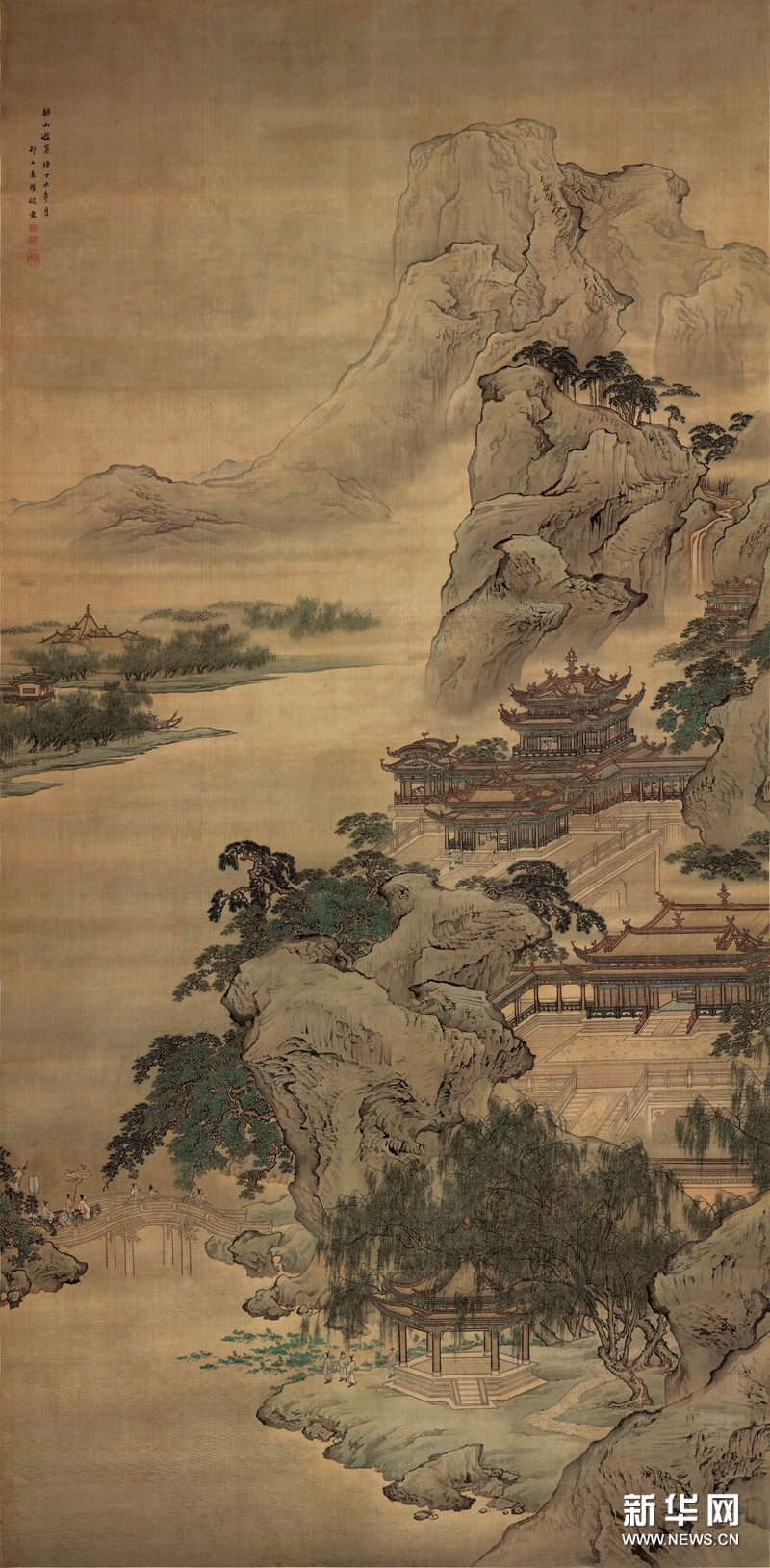 袁耀,清代畫家。字昭道,江都(今江蘇揚(yáng)州)人。畫家袁江之侄。約活動(dòng)于乾隆中期,以界畫見長(zhǎng),工整華麗,畫風(fēng)與袁江相近。偶作花鳥,亦甚佳。袁耀擅作山水,樓閣界畫,氣勢(shì)恢弘,題材常為《驪山避暑》、《蓬萊仙島》等歷史故事和神話傳說,且能作高頭大卷,其精品甚至超過袁江。此畫描繪唐明皇前往驪山華清宮避暑消夏的情景,畫面遠(yuǎn)景高山崇嶺,云霧繚繞,層層樓閣,華美壯觀,如瓊池仙宮。畫面左下方雕砌精美的石橋上,一行宮中人往樓閣的方向去,華蓋、羽扇彰顯尊貴身份。袁耀將傳統(tǒng)建筑畫與院體山水巧妙相融,其華麗精致的風(fēng)格,為清初揚(yáng)州工致流派的典型代表。