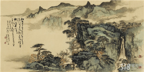 范陽(yáng)先生的山水畫(huà),筆法近取傅抱石、黃秋園,遠(yuǎn)溯“元四家”中黃公望、王蒙。筑居楊岐山下,使先生日夜親近自然山水,吐納天地,養(yǎng)浩然之氣?!巴鈳熢旎?,中得心源”,唐代張璪一言道破了山水畫(huà)家修養(yǎng)、悟性的不二法門(mén)。范陽(yáng)先生正是以自然(造化)為營(yíng)養(yǎng),入而為心靈化育,镕冶成亦古亦新,遠(yuǎn)離塵俗的獨(dú)特風(fēng)格。近作《松風(fēng)泉聲》(五屏聯(lián))氣勢(shì)磅礴,大開(kāi)大合,細(xì)究又十分謹(jǐn)嚴(yán)。筆墨與丘壑融為一體,既豪放又穩(wěn)健。淺絳青綠的設(shè)色,使畫(huà)面有蔥翠欲滴之感??胺Q(chēng)山水畫(huà)中的經(jīng)典。