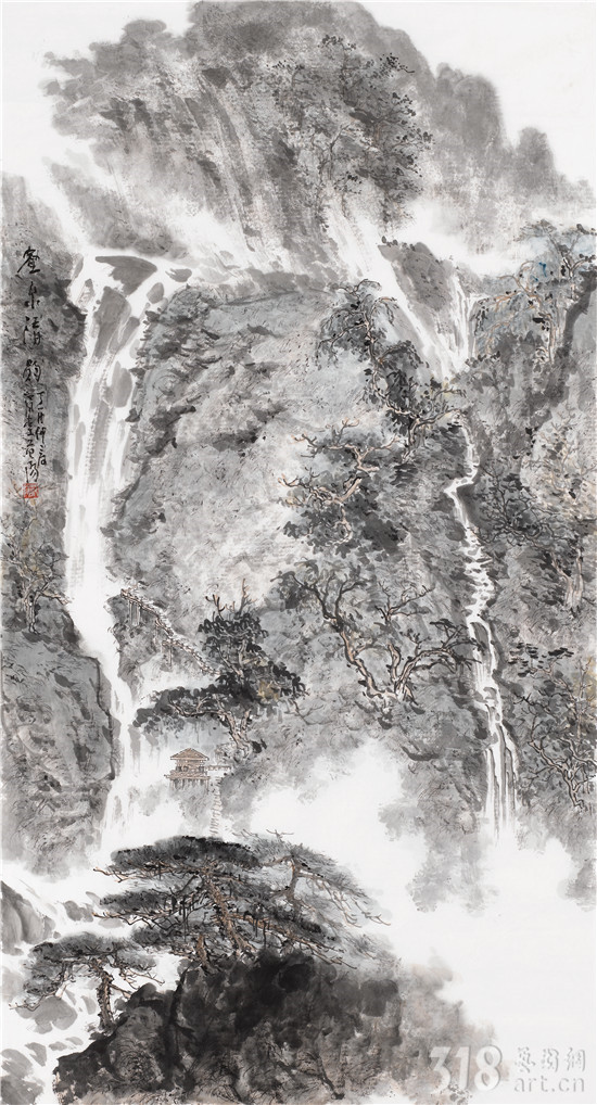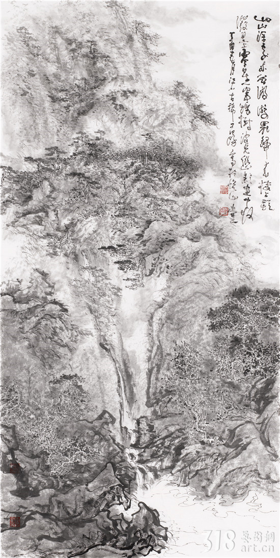 我以為,范陽(yáng)先生是真正在心性上貼近古人“不下堂筵,坐窮泉壑”,其現(xiàn)居贛中名岳武功山、楊岐山之中。尤其武功山,史上與衡山、廬山并稱(chēng)江南三大名山,被冠以“衡首廬尾武功中”,山脈綿延浩瀚,茫茫無(wú)際。范陽(yáng)先生終日面山臨壑,弄筆自適,得武功真容。山水畫(huà)從來(lái)就不是簡(jiǎn)單的描摹自然的風(fēng)光,無(wú)論丘園養(yǎng)素還是泉石嘯傲,都是畫(huà)者精神的自然流露,這是畫(huà)家筆墨情態(tài)的表達(dá),亦是畫(huà)家藝術(shù)境界追求的體現(xiàn)。對(duì)于山林的描繪,承載了畫(huà)者對(duì)泉石意趣的向往,對(duì)于林下境界的追求。范陽(yáng)先生的山水畫(huà)作品長(zhǎng)于布景,對(duì)山中的“陰、晴、朝、夕”的細(xì)膩描繪都有他自已獨(dú)特感悟和表達(dá)。筆下極丘壑浩渺之勢(shì),奇峰羅列,宛有風(fēng)骨,深壑幽谷,其勢(shì)超峻;至于松柏掩映,峭壁涌泉,野道幽麓,于野逸之態(tài)甚備。范陽(yáng)先生數(shù)十年來(lái)遍臨南北宗諸家,遠(yuǎn)溯元人四家,清初四王,近至黃秋園,上下求索,崇穆有加,最終歸皈真逸正脈。新近年逾七十之作,日漸精熟,蒼腴古厚,更趨融古化古之態(tài),細(xì)究其筆下蹤跡:子久?麓臺(tái)?秋園?各不相肖,而莫不精備。諦觀其中景象:匡廬?武功?羅霄?渾然而化,不一而足。如此境地當(dāng)稱(chēng)“妙解”。