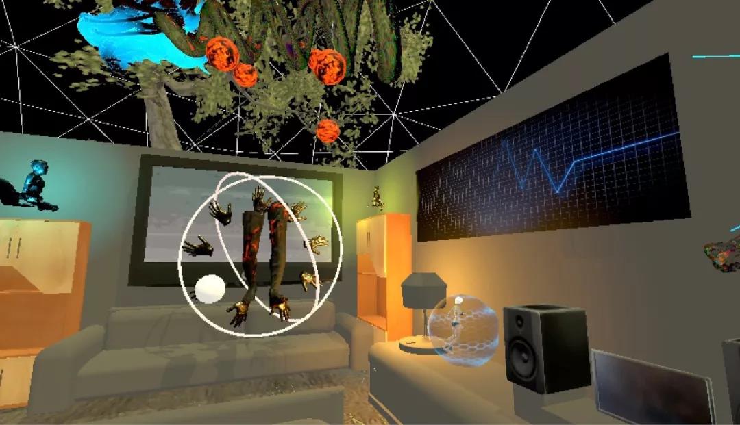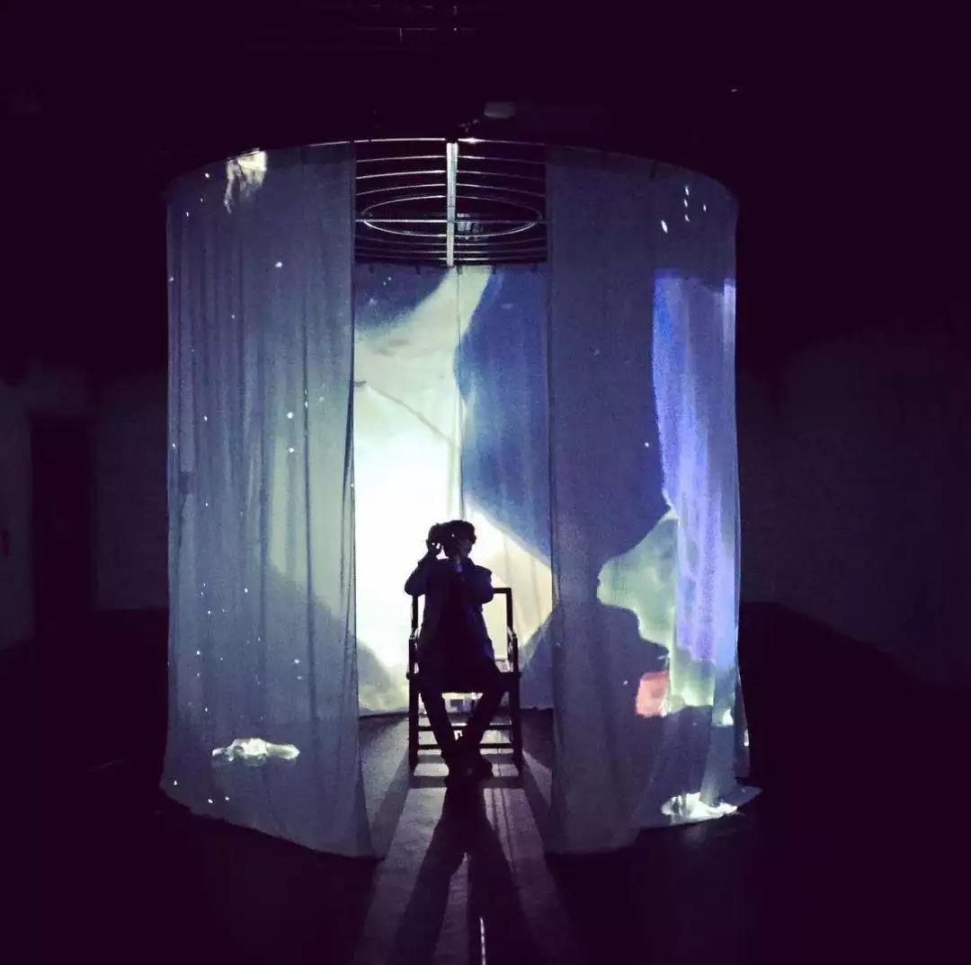 《覺(jué)醒之屋》鍍鋅鐵支架,網(wǎng)格布,三屏實(shí)時(shí)動(dòng)畫(huà),VR裝置,椅子,2018