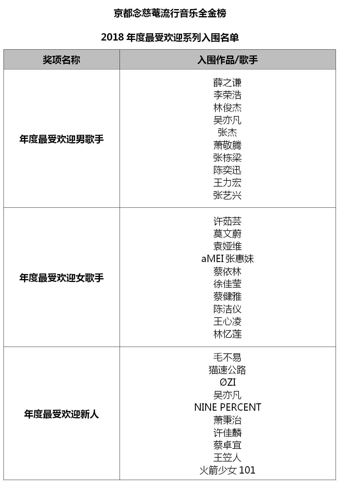 “年度最受歡迎樂隊/組合”入圍名單中,同在2018年成功舉辦巡回演唱會的五月天、S.H.E等老牌組合的進榜,讓大家看到了華語樂壇常青樹的非凡音樂實力;八三夭、C.T.O、BBT、FS Fuying&Sam、頑童MJ116等組合,憑借不減反升的人氣魅力實力進榜;而NINE PERCENT、火箭少女101及貓速公路等新人組合的二次入圍,不僅僅是對他們在音樂成績上的肯定,更是對其未來之路的鼓勵。