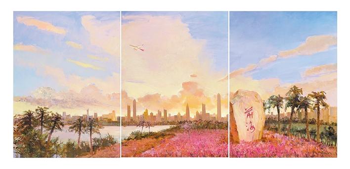 在創(chuàng)作中,文禎非用了現(xiàn)實的元素,前海標(biāo)志性石碑,棕櫚樹代表著南方特征,前海距離寶安機場很近,天空中的深航飛機象征著深圳開放的胸懷,遠處平安大廈等標(biāo)志性現(xiàn)代化建筑一字排開,地面是深圳市花簕杜鵑……“這些都是深圳人熟悉的現(xiàn)實素材,在畫面展現(xiàn)時更多地把對深圳未來發(fā)展的憧憬和信心放入了畫面,調(diào)整了前海石碑與建筑的視覺關(guān)系,地面一片簕杜鵑是深圳創(chuàng)業(yè)初期英雄主義激情的象征,更代表著新時期深圳創(chuàng)新創(chuàng)造的活力與熱情;現(xiàn)代建筑的背景也預(yù)示著深圳40年來的成就也為前海發(fā)展提供了堅實基礎(chǔ);早晨天空中朝霞放射狀的光芒萬丈,表達了對未來的憧憬……”文禎非滔滔不絕中透露出創(chuàng)作時的激情。