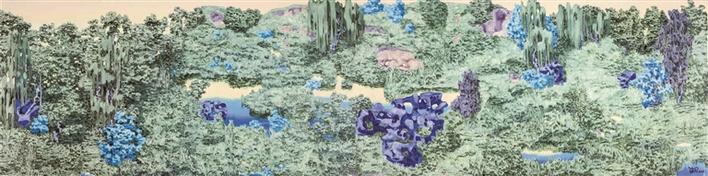 扈海風(fēng)的繪畫,呈現(xiàn)出一種介于中國水墨與西方架上藝術(shù)之間的視覺效果,具有中國水墨的時(shí)空韻腳。扈海風(fēng)用近乎絲網(wǎng)印刷的平涂手法,對(duì)幾個(gè)具有中國元素的形象符號(hào)展開審視。那些原本存在于古典語境中的符號(hào)經(jīng)歷復(fù)制、重疊等過程而被重塑,還原成山水或風(fēng)景,成為藝術(shù)家筆下的“中國花園”。