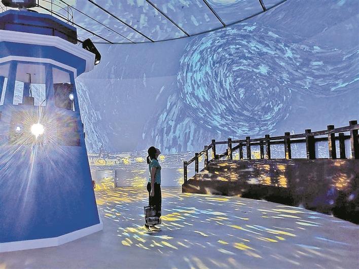 展覽不再局限于傳統(tǒng)的作品觀賞,而是通過(guò)感受藝術(shù)與科技的有機(jī)融合,走近藝術(shù),走進(jìn)內(nèi)心,喚醒大眾對(duì)藝術(shù)認(rèn)知的渴望。當(dāng)日,記者作為首批觀眾步入展廳先行體驗(yàn)。展廳內(nèi)部猶如一個(gè)夢(mèng)幻的梵高光影世界,首先映入眼簾的是《花瓶與鳶尾花》《盛開的杏林》的動(dòng)態(tài)投影,不少觀眾忍不住拍照留影。不僅有流動(dòng)的光影還有流淌的音樂(lè),宛如進(jìn)入一個(gè)夢(mèng)幻的異次元。最令人震撼的是“星空”展廳,在這個(gè)獨(dú)立的展廳里,環(huán)形的墻壁、天花板都被打上了梵高名畫《羅納河上的星空》投影,星星在天花板上、在四周的墻壁上、在地板上不停旋轉(zhuǎn),讓人頗有暈眩之感。展覽還開發(fā)了一些互動(dòng)性很強(qiáng)的小游戲,不少年輕觀眾表示,展覽形式新穎、獨(dú)特,讓人忍不住想拍照發(fā)朋友圈,而這也是《追光者——天才梵高筑夢(mèng)大展》的獨(dú)到之處。