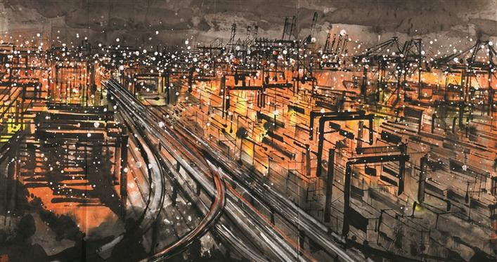 楊曉洋創(chuàng)作的《東方巨港——璀璨鹽田》是此次入選的國畫作品之一。作品以深圳港夜色為主題,體現(xiàn)了中國改革開放前沿城市深圳滄海桑田的巨變和這座城市的繁榮景象。同樣是表現(xiàn)現(xiàn)代題材的城市景觀,從楊曉洋的作品中就可看出以對版畫的黑白對比手法、平面構(gòu)成的象征形式、夜景特色的表現(xiàn)手法的出色運用等方式來表達(dá)出作者對都市景觀的趣味。
