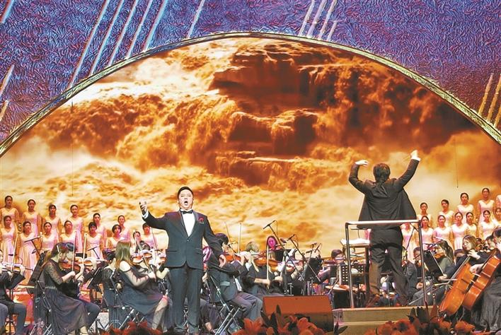 在盧向榮的慷慨激昂的朗誦中,青年歌唱家唱響了整部《黃河大合唱》。通過《黃河船夫曲》《黃河頌》《黃河之水天上來》《黃水謠》《河邊對口曲》《黃河怨》《保衛(wèi)黃河》《怒吼吧,黃河!》八個樂章,贊美中華民族堅(jiān)貞不屈、頑強(qiáng)抗?fàn)幍挠⑿蹥飧?,為觀眾呈現(xiàn)了一臺凝聚偉大靈魂、提供強(qiáng)大精神激勵的聽覺盛宴。
