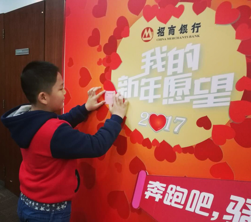 伴隨2017年新春佳節(jié)的臨近,走進(jìn)招商銀行的營業(yè)廳,喜慶、溫情、熱鬧的節(jié)日氛圍感染了每一位客戶?!案4砦业男摹?、“美好心愿帶回家”、“我對小招有話說”、“親情定制”等帶有濃厚春節(jié)特色的活動主題迅速吸引了眾人的注意力,在記者左顧右盼的間隙,新年許愿墻前面留下了許多虔誠的身影……