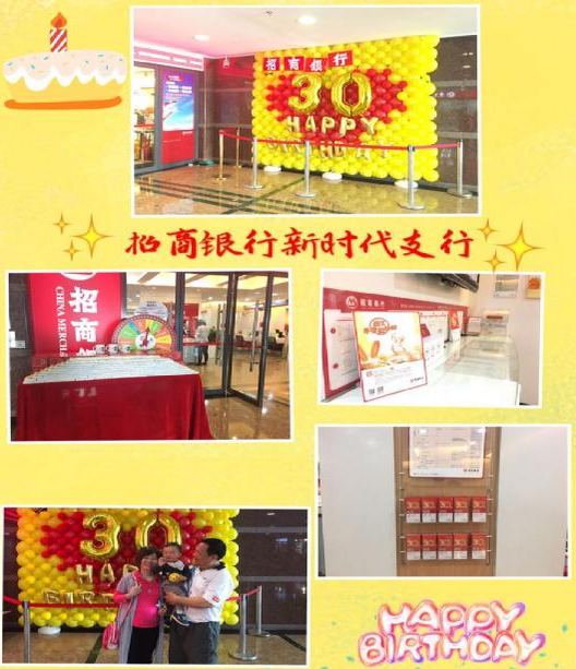 為慶祝招商銀行成立三十周年,招商銀行深圳新時(shí)代支行裝飾了一面喜慶的合影墻,供客戶拍照留影。與此同時(shí),網(wǎng)點(diǎn)還舉行了一系列生日月活動(dòng):