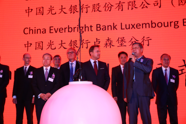 盧森堡首相格扎維?!へ愄?、財(cái)政大臣皮埃爾·格拉美亞、中國(guó)駐盧森堡大使黃長(zhǎng)慶、中國(guó)光大集團(tuán)暨中國(guó)光大銀行董事長(zhǎng)、中國(guó)國(guó)際商會(huì)副會(huì)長(zhǎng)兼任中國(guó)-盧森堡商務(wù)理事會(huì)主席唐雙寧啟動(dòng)了當(dāng)天的揭牌儀式并致辭。同時(shí)上臺(tái)見(jiàn)證揭牌儀式的還有盧森堡金融監(jiān)管委員會(huì)總裁克勞德·馬科斯、盧森堡金融推廣署總裁尼古拉斯·馬科爾、安永盧森堡執(zhí)行合伙人阿蘭·喀什、盧森堡銀行家協(xié)會(huì)主席伊夫斯·馬思、盧森堡駐華大使馬克·惠步舒、國(guó)際金融協(xié)會(huì)執(zhí)行副總裁航·特朗、中國(guó)光大銀行副行長(zhǎng)兼光銀歐洲董事長(zhǎng)馬騰,以及光銀歐洲董事等。