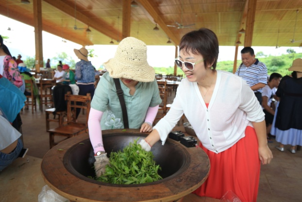 體驗(yàn)采一簍初露山茶。自駕之旅第二天,大人孩子們?cè)谟⒌虏枞@體驗(yàn)了滿滿的茶趣:山間采茶,鐵鍋炒茶,雙手搓茶,悠閑品茶,在裊裊茶香間流連。