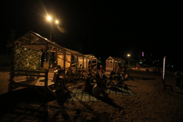 體驗(yàn)看一場(chǎng)露天電影。晚餐后的大人孩子們或鉆進(jìn)自己搭建的木屋,或坐在木屋前,并肩看暖心電影《奇跡男孩》。