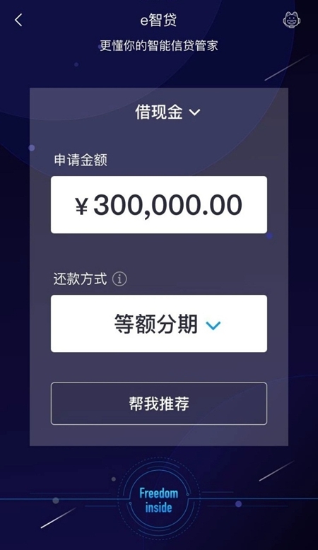 全新升級Freedom引擎后的e智貸,借助其自身的Freedom核心推薦的強(qiáng)大功能,通過極速的信息搜集和計(jì)算,可秒級判斷可貸額度,并為客戶量身推薦e招貸、e閃貸、分期還款等多種產(chǎn)品。