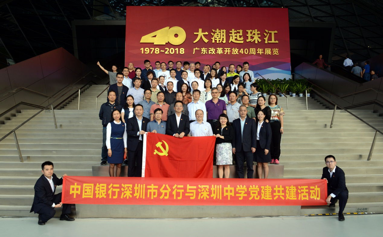 近日,中國銀行深圳東門管轄支行與深圳中學開展黨建共建活動,雙方黨員代表共同前往深圳改革開放展覽館,參觀了“大潮起珠江——廣東改革開放40周年展覽”。深圳中行蒙震紀委書記和深圳中學王東文副校長帶領黨員代表參加了此次活動。