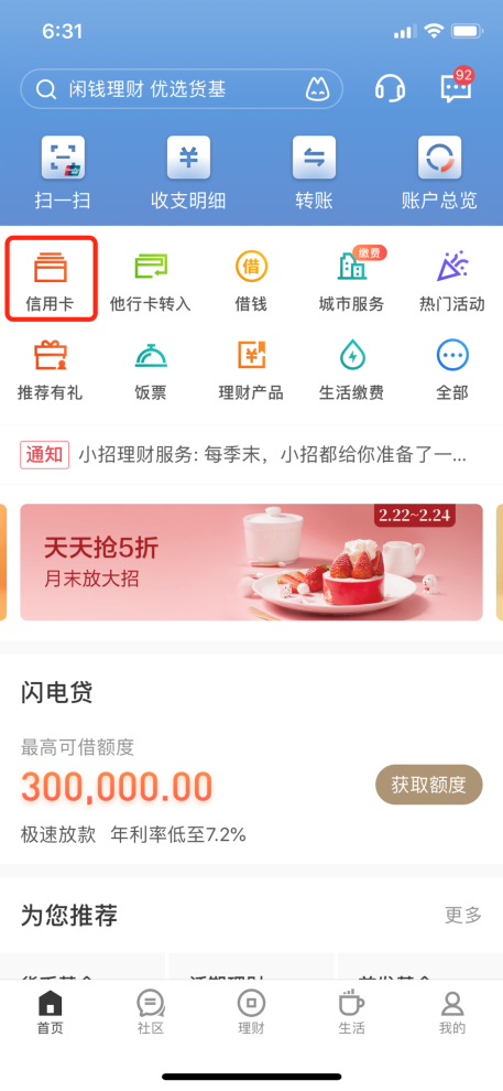 打開招商銀行App,在首頁點(diǎn)擊“信用卡”進(jìn)入信用卡界面,點(diǎn)擊“還款”根據(jù)提示即可在線還款。