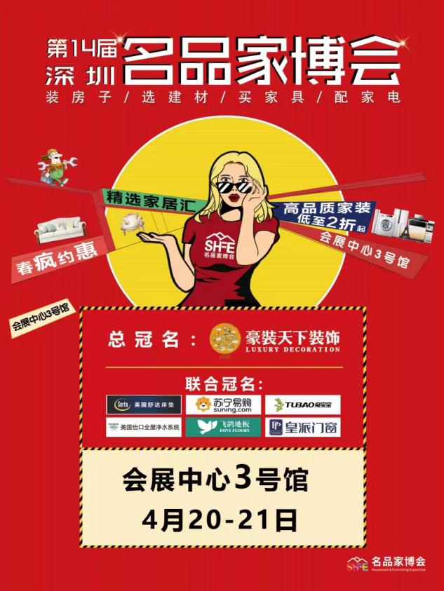 由豪裝天下裝飾集團(tuán)總冠名并聯(lián)合蘇寧易購(gòu)、美國(guó)舒達(dá)床墊、飛鴿地板、皇派門窗共同助力的第14屆深圳名品家博會(huì),將于4月20日—21日舉行在深圳會(huì)展中心舉辦。千余個(gè)家居一線品牌、萬(wàn)余款家裝大牌產(chǎn)品齊聚本屆深圳家博會(huì),將為深圳數(shù)萬(wàn)裝修家庭帶來(lái)驚喜與福利。