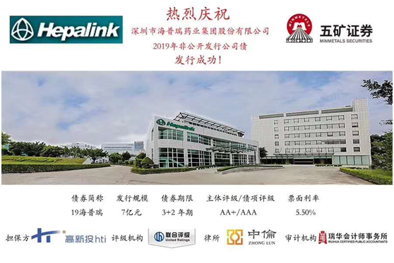 據(jù)悉,此次私募債券“19海普瑞”發(fā)行規(guī)模為7億元,期限3+2年,票面利率5.5%。在深圳高新投的助力下,債券募集過(guò)程中,得到了各大金融機(jī)構(gòu)的踴躍認(rèn)購(gòu),獲得2倍超額認(rèn)購(gòu)額,5.5%的票面利率也創(chuàng)下近期AA+民營(yíng)企業(yè)發(fā)債利率新低。