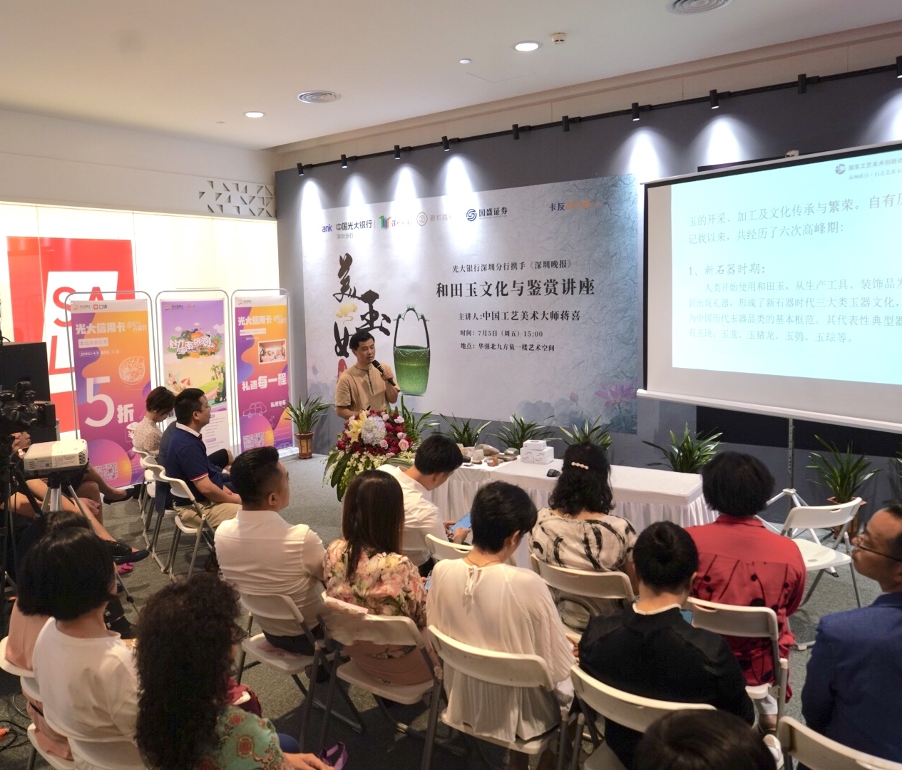 在講座中,蔣喜先生圍繞美玉初探;師古而不擬古——貴在創(chuàng)新等內容進行了分享,對當代玉雕創(chuàng)作中的師古與創(chuàng)新進行了深入淺出的講解,讓現(xiàn)場嘉賓獲益匪淺。在講座現(xiàn)場,光大銀行深圳分行的工作人員為到場嘉賓介紹了個人理財、私行業(yè)務、出國金融、信用卡業(yè)務等多個產品業(yè)務,讓聽眾對光大銀行金融產品有了更深入的了解。