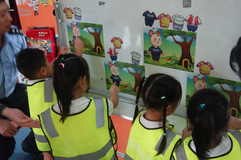 熊警官從交通工具講起,分別講述了乘坐不同交通工具所帶來的風(fēng)險(xiǎn)及注意事項(xiàng),并通過幽默風(fēng)趣的“兒童安全座椅”小視頻,提醒在座的小朋友及家長要注意細(xì)節(jié),具有防范風(fēng)險(xiǎn)的意識(shí)。在互動(dòng)游戲環(huán)節(jié),熊警官通過與小朋友們的互動(dòng),講解了紅綠燈的來源、日常的交通標(biāo)識(shí)以及過馬路的規(guī)則。現(xiàn)場的同學(xué)們也非常踴躍,在“被看見才安全”環(huán)節(jié)時(shí),許多小朋友主動(dòng)上臺(tái),給小兔子穿上最亮最顯眼的衣服,使其成為最靚的仔。