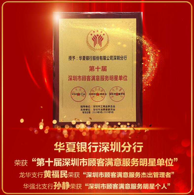深圳新聞網(wǎng)訊 近日,華夏銀行深圳分行在“第十屆深圳市顧客滿意服務(wù)明星”暨“第二屆深圳市優(yōu)質(zhì)服務(wù)示范單位”評選活動(dòng)中,榮登“深圳市顧客滿意服務(wù)明星單位”榜首,“華夏服務(wù)”品牌影響力再次得到行業(yè)和客戶的高度認(rèn)可。同時(shí),該行龍華支行行長黃福民、華強(qiáng)北支行副行長孫靜分別獲得“深圳市顧客滿意服務(wù)杰出管理者”和“深圳市顧客滿意服務(wù)明星”榮譽(yù)稱號(hào)。