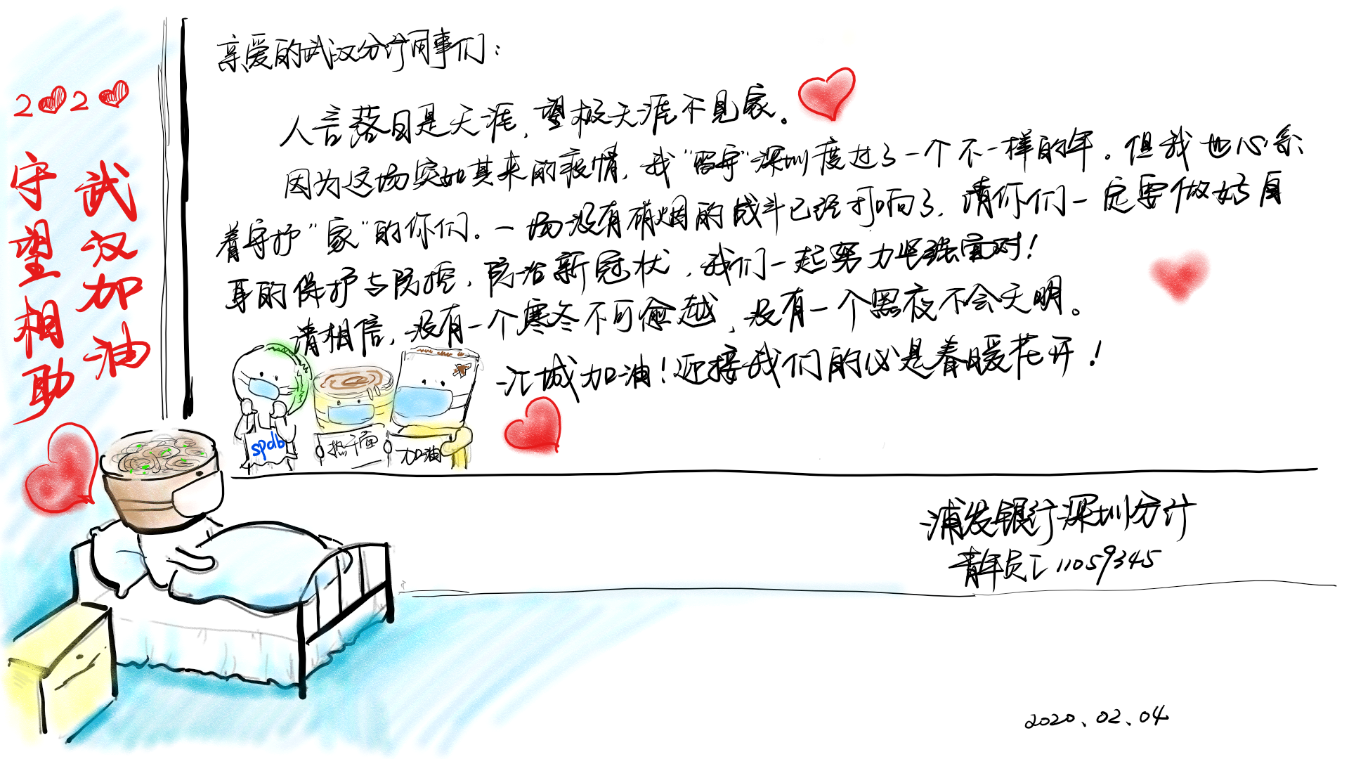 2月3日,浦發(fā)銀行深圳分行團委向全體青年員工發(fā)出了一封倡議書。在倡議書中,該行團委號召廣大團干部、團員青年立即行動,充分發(fā)揮黨的助手和后備軍作用,展現(xiàn)青年突擊隊作為,為堅決打贏疫情防控阻擊戰(zhàn)貢獻力量,并向青年提出三個要求:“堅定信心不迷茫,聽黨指揮勇?lián)敗薄ⅰ翱茖W防范不信謠,眾志成城控疫情”、“居家辦公不離崗,服從指揮勇?lián)敗?。當日,浦發(fā)銀行深圳分行發(fā)起了給武漢分行同事寄送家書的活動,該行全體青年手寫家書,圖文并茂、紙短情長,表達了對疫區(qū)“戰(zhàn)友們”最深切的關(guān)愛和鼓勵,身體力行做好他們堅強的后盾。