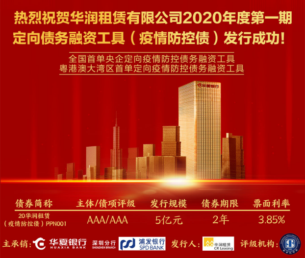 深圳新聞網(wǎng)2月29日訊 2月28日,由華夏銀行深圳分行主承銷的華潤(rùn)租賃有限公司2020年度第一期定向債務(wù)融資工具(疫情防控債)成功發(fā)行,該債券是全國(guó)首單央企疫情防控定向債務(wù)融資工具,也是粵港澳大灣區(qū)首單疫情防控定向債務(wù)融資工具。