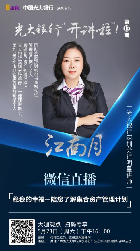此次,光大銀行深圳分行攜手《深圳晚報》邀請CFP資格認(rèn)證國際金融理財師、該行年度“十佳理財能手”、明星講師江南月帶來《穩(wěn)穩(wěn)的幸?!隳私饧腺Y產(chǎn)管理計劃》主題分享,幫助更多客戶深入了解并購買集合資產(chǎn)管理計劃產(chǎn)品。講師江南月將從集合資產(chǎn)管理計劃的基本概念和產(chǎn)品優(yōu)勢出發(fā),深入淺出,讓更多客戶了解集合資產(chǎn)管理計劃產(chǎn)品,并幫助客戶選擇購買這類產(chǎn)品。該行代銷的純債類集合資產(chǎn)管理計劃一直以來都以穩(wěn)健著稱,目前已到期產(chǎn)品全部達(dá)到了業(yè)績比較基準(zhǔn),設(shè)置超額收益的產(chǎn)品也都為客戶實現(xiàn)了超額回報。