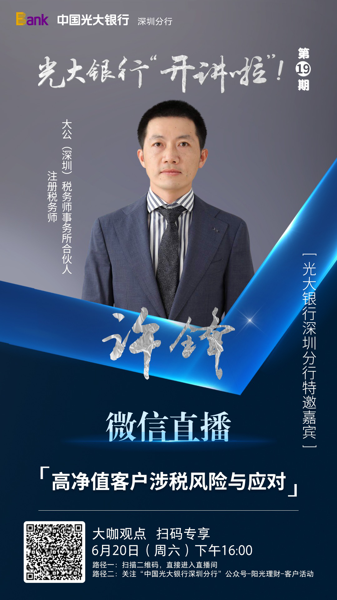 此次公益課堂邀請到大公(深圳)稅務(wù)師事務(wù)所合伙人、注冊稅務(wù)師許鋒,在線為客戶開講《高凈值客戶涉稅風(fēng)險與應(yīng)對》。他從當(dāng)前稅務(wù)形勢及改革方向、征管變化、企業(yè)及高凈值個人稅務(wù)管理與籌劃等幾個層面開講,深入剖析了中國稅制特點(diǎn);并列舉具體案例,結(jié)合當(dāng)前稅收管理制度與政策,講解企業(yè)高管、高凈值人群在不動產(chǎn)投資、股權(quán)投資、公私混同的涉稅風(fēng)險;剖析家族企業(yè)股權(quán)傳承中的稅務(wù)規(guī)劃,如何打破“富不過三代”的魔咒,以及在CRS全面啟動背景下,高凈值人士如何應(yīng)對?幫助提示企業(yè)及高凈值人群,在稅務(wù)管理“全監(jiān)管”的時代,早做稅務(wù)規(guī)劃,規(guī)避稅務(wù)風(fēng)險,做到“稅稅平安”。