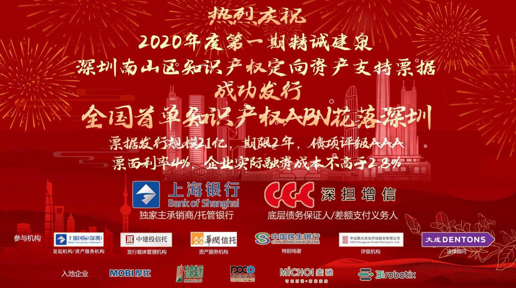 深圳新聞網·見圳客戶端2020年9月23日訊 昨日,隨著上海銀行股份有限公司主承的“上銀國際投資(深圳)有限公司2020年度第一期精誠建泉深圳南山區(qū)知識產權定向資產支持票據”成功發(fā)行,中國銀行間交易商協(xié)會首單民營科技中小企業(yè)專項知識產權ABN項目花落深圳。該項目不僅是對知識產權證券化的一次創(chuàng)新和實踐,也為中小民營科技企業(yè)開辟了一條在銀行間市場融資的新渠道。本期ABN共五家入池企業(yè),發(fā)行規(guī)模2.1億元,期限兩年,票面4%,經南山區(qū)政府補貼和深圳擔保集團費用減免,入池企業(yè)實際融資成本低于年化2.80%。 一直以來,上海銀行以“精誠至上,信義立行”為核心價值觀,堅持“融智”與“融資”有機結合,以實體經濟需求為導向,不斷推進產品創(chuàng)新,持續(xù)為實體經濟發(fā)展提供更高質量、更有效率的金融服務。此次首單知識產權ABN項目花落深圳,不僅是深圳不斷強化金融創(chuàng)新所取得的重要成果,更是上海銀行探索服務深圳、服務實體經濟新模式的重要實踐。