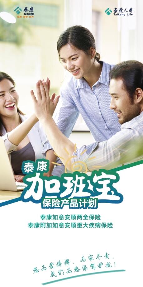 泰康加班寶保險(xiǎn)產(chǎn)品計(jì)劃由《泰康如意安順兩全保險(xiǎn)》及《泰康附加如意安順重大疾病保險(xiǎn)》組成。主險(xiǎn)泰康如意安順兩全保險(xiǎn)產(chǎn)品提供身故及生存保障;附加險(xiǎn)泰康附加如意安順重大疾病保險(xiǎn)產(chǎn)品提供重疾、輕癥和輕癥豁免保費(fèi)保障。