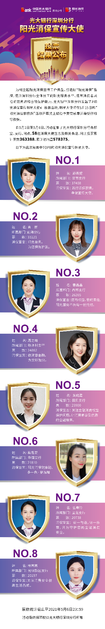 深圳新聞網(wǎng)·見圳客戶端2021年5月8日訊 昨日,光大銀行深圳分行“陽光消保宣傳明星大使”線上投票圓滿結(jié)束,從58名宣傳大使中投票產(chǎn)生了賴春妮、肖雨、曹晶晶、周之靖、黃曉霞、蔣易萱、曾粵玲、林思思8名陽光消保宣傳明星大使。明星大使將在5月15日的“陽光消保健康跑”活動開幕式上被授予榮譽勛章并接受行領(lǐng)導授旗。5月1日,光大銀行深圳分行發(fā)起了“陽光消保宣傳明星大使”線上投票,旨在樹立起陽光消保宣傳工作典型,打造“陽光消保”品牌,提升深圳分行全體員工的陽光服務(wù)水平,提高消費者風險防范意識和自我保護能力,提升光大在深圳地區(qū)的品牌影響力。投票活動得到社會熱烈響應(yīng),據(jù)統(tǒng)計,此次累計票數(shù)達363388次。