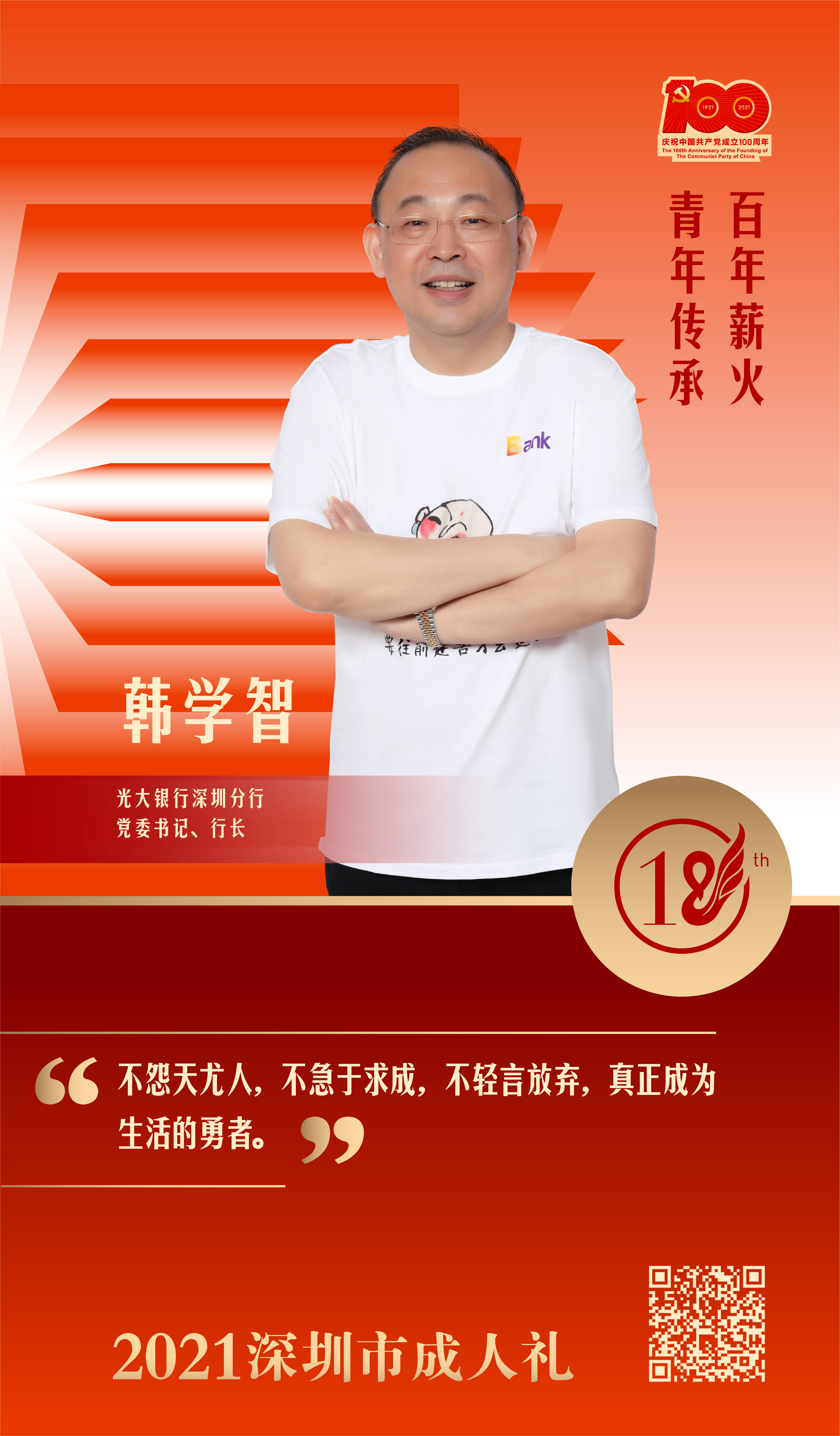 深圳新聞網(wǎng)·見圳客戶端2021年5月10日訊“以‘三勤四慎’提升青年生活幸福感,希望年輕人能勤于思考,善于思考,學會從思考中發(fā)現(xiàn)問題,解決問題,這樣才能取得更快的進步?!痹?月7日拉開序幕的“百年薪火,青年傳承”2021深圳市成人禮系列活動中,光大銀行深圳分行黨委書記、行長韓學智作為青春代表,通過網(wǎng)絡渠道,為青年們送上飽含激情和期待的寄語“明信片”。